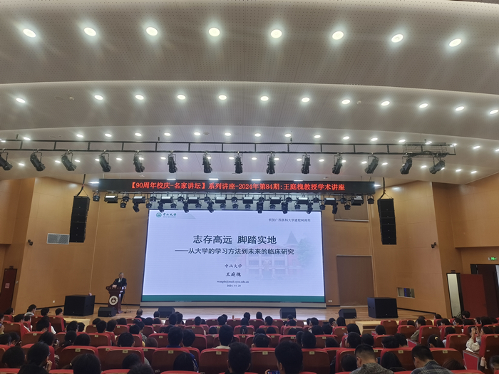 11月21日上午,太阳成集团tyc151cc90周年校庆“名家讲坛”系列讲座第84期讲座在武鸣校区图书馆报告厅顺利举行。国家级教学名师、中山大学王庭槐教授为太阳成集团tyc151cc师生带来一场以“生理学专家导航:从大学的学习方法到未来的研究之路”为主题的学术盛宴,吸引了400余名员工报名参加,讲座由基础医公司党委副书记王闻楚主持。